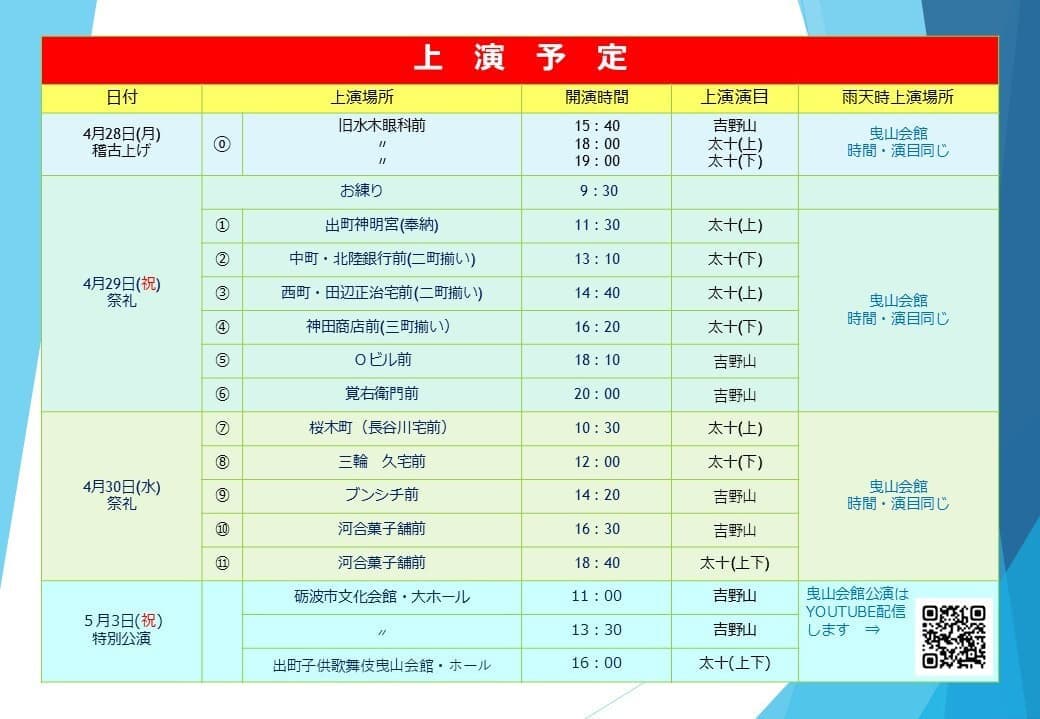 ■4/29、時折小雨がぱらつき寒い日でしたが予定通り上演が行われ、出町子供歌舞伎の歴史を確実に繋ぎました。子供たちは稽古の成果を十分に発揮して、大きな声援を頂きました。
