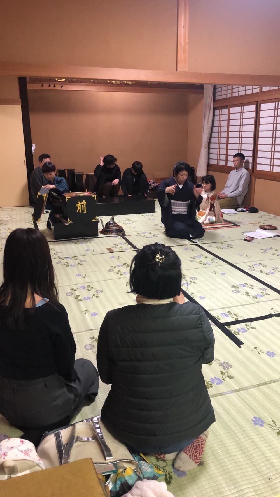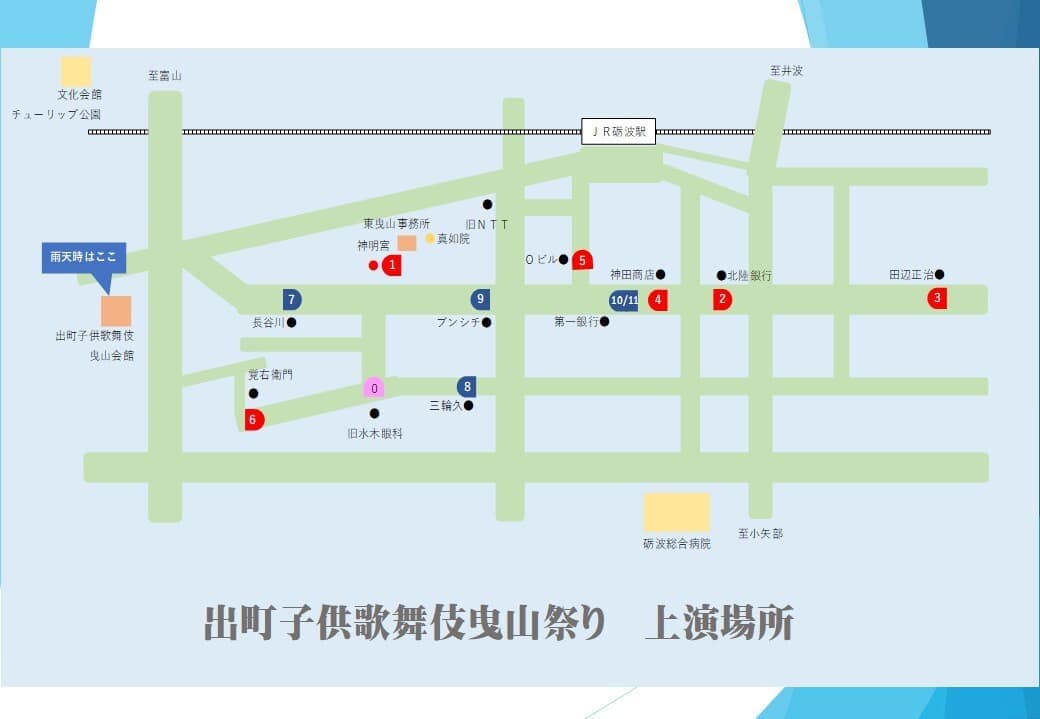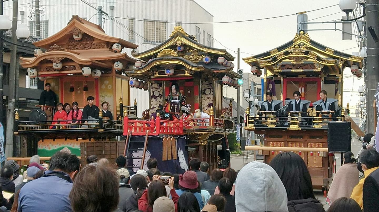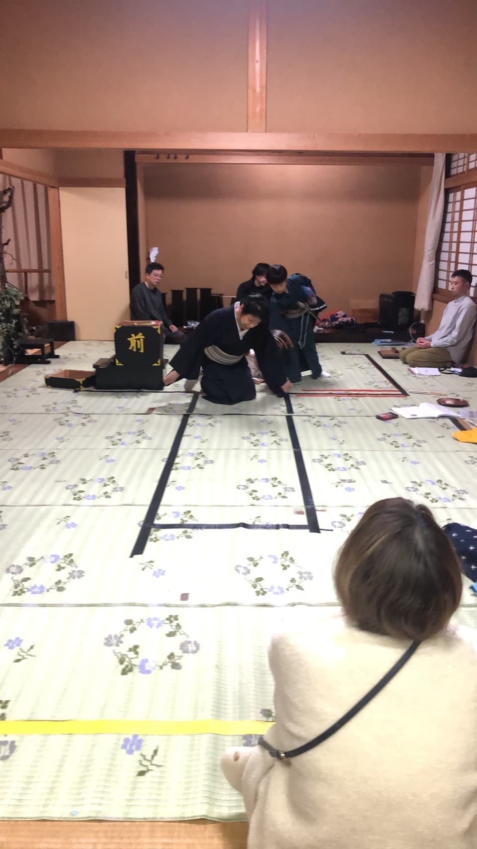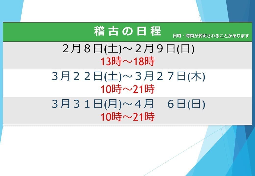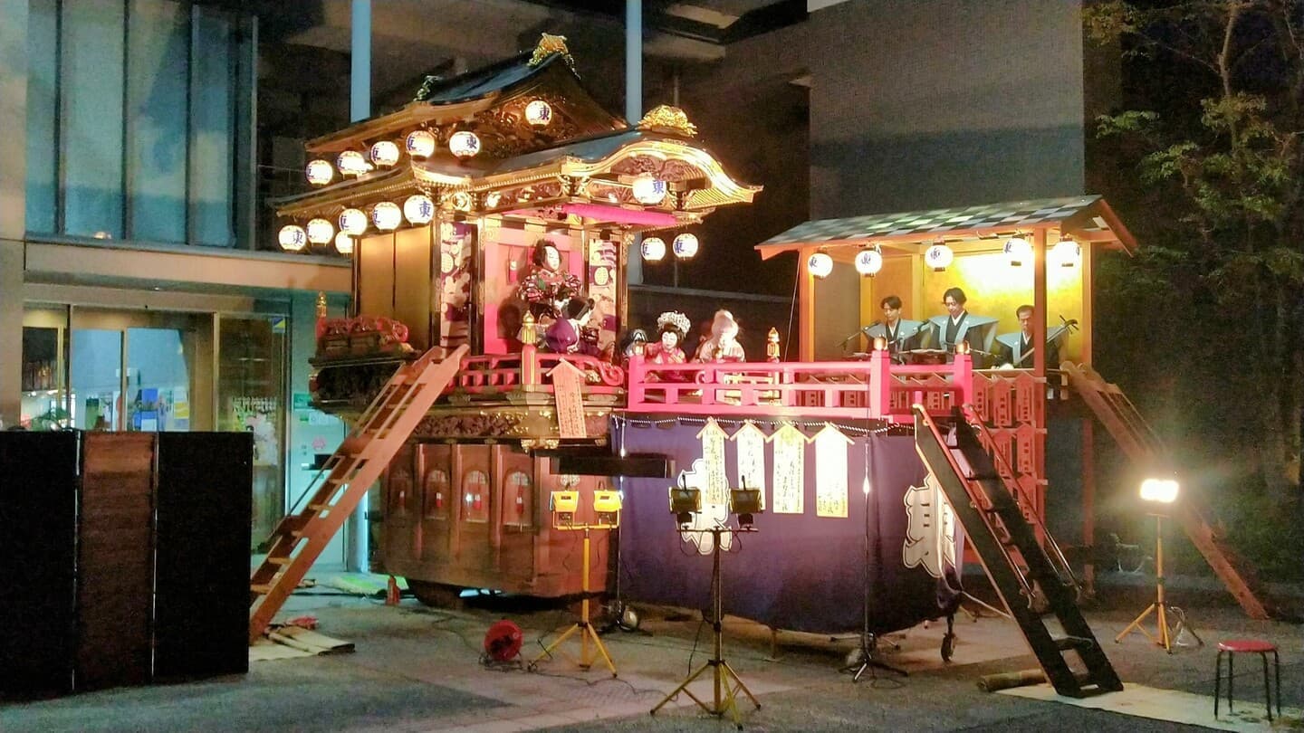 ■4/28の稽古上げが、天候不順により当初の予定を変更し曳山会館の庇下で行われました。稽古上げは、明日の本番に向けてのリハーサルで、本番同様の鬘・衣裳を着けて、吉野山の段、絵本太功記の上・下を一通り行う、最終確認の目的で行われるものです。