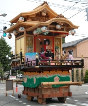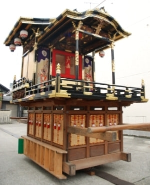 1789年(天明9年)に造られたとされ、3基の中で最も古いものです。建造当初の芝居舞台は仮舞台程度のもので、そこで人形浄瑠璃が上演されており、慶応年間(1865-68)に現在の姿に改造されています。見返り(背面)に施された大彫刻(関羽読書図)と、高欄以外は白木のままの御殿が特徴です。車輪は4輪の内車様式で、二重の屋根は平成11年に実施された解体修理で、固定式に改められました。3基の中で最も大きな曳山で、高さは約6mあります。