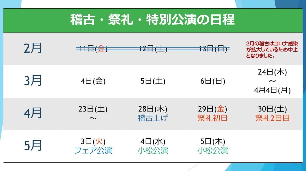 2月の稽古が中止となり、子供たちは台本読みの自主練をしていましたが、3月4日~6日の3日間、立ち稽古が行われ所作の稽古が始まりました。(2022.3.5)