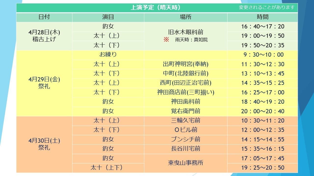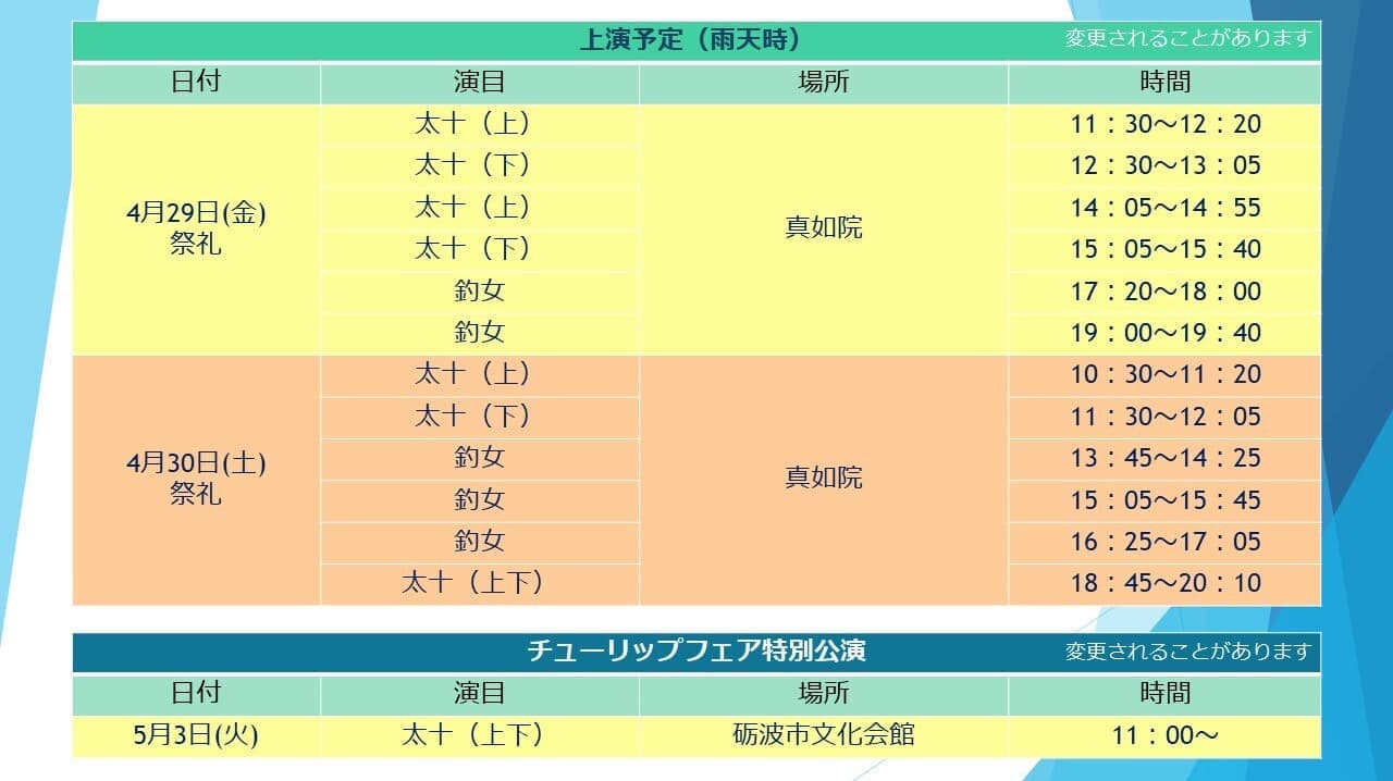 祭礼・チューリップフェア特別公演の上演予定(雨天時)を変更しました。(2022.4.7)