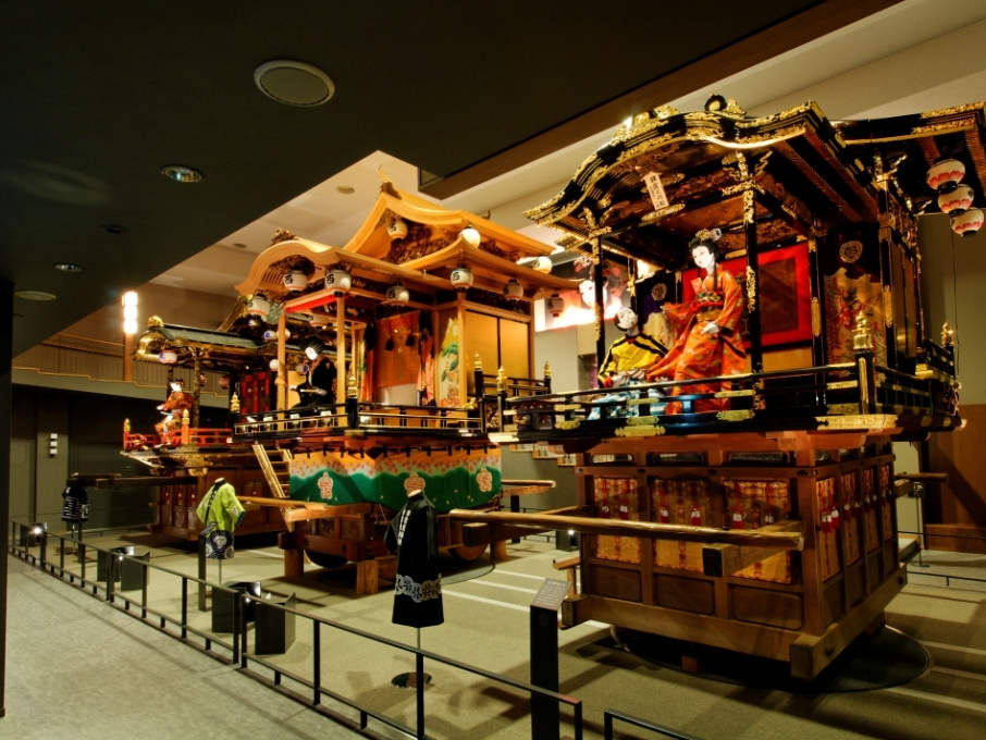 曳山展示 これまで、各町内の山蔵に保管されてきた曳山を一同に展示するとともに、 曳山にまつわるさまざまな資料、煌びやかな衣裳・小道具類の数々、出町の歴史・文化を紹介しています。