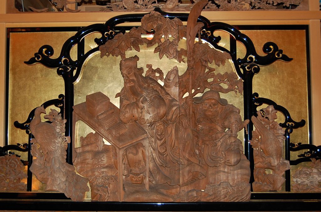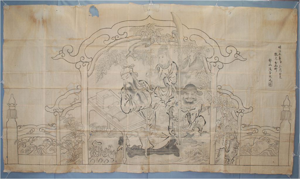平成18年(2006)、木彫りの町井波の老舗 番匠屋で、 西町の見返りの彫刻「関羽読書図」の下絵が発見されました。下絵には「明治五年」とあり、幕末から明治にかけて行われた、曳山改修の際に描かれた下絵であることがわかりました。 同時に発見された百数十枚の下絵についても照合が進められると、西町曳山の欄間や破風、東曳山の欄間の下絵などが確認されました。