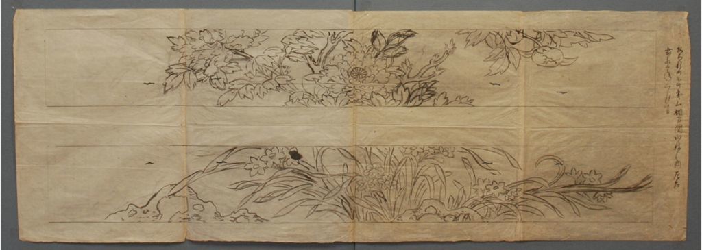 その中でも、幕末に描かれた東曳山の欄間下絵は、明治33年(1900)の大火で焼失する以前の初めての資料として注目されます。特に嘉永2年(1849)に描かれた スイセンとボタンの欄間の下絵は、東の山蔵で古くから保管されてきた欄間と一致することが判明しました。