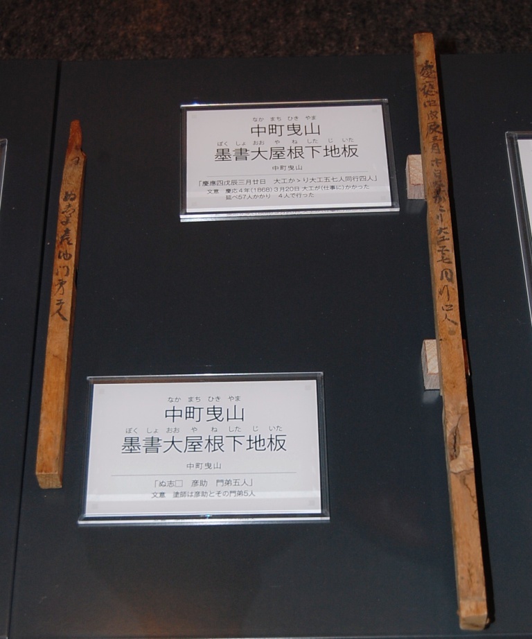 中町曳山は、平成14年(2002)から3年に渡って行われた解体修理作業の中で、 大屋根や正面妻側の下地板から、幕末に行われた曳山改修に関する墨書が発見されました。この墨書によれば、慶応4年(1868)3月に大工4人がかりで16日間の修理が実施されたことや、6人の塗師によって漆塗りが行われたことなどがわかり、 少なくとも江戸末期には、現在とほぼ同じ形の曳山であったと考えられます。