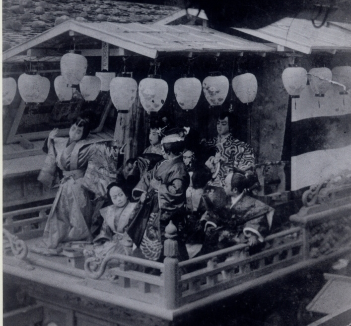 再建中の東曳山(仮屋根での上演) 明治33年(1900)8月19日、出町は空前の大火に見舞われ、東曳山が焼失してしまいます。 以来、町の人たちの曳山再建に向けた努力が長年にわたって続けられることになります。まず、大正8年(1919)に曳山の台部が完成し、この年から仮舞台での子供歌舞伎の上演が再開されました。次に上部の建造の計画が立てられ、 大正10年(1921)9月18日、出町神明宮の社務所において、日掛銭1日2銭を月に2回集金する覚書に146人の署名を集めて、工事が始められました。その後、逐次塗りや金箔の装飾が施されていき、台部ができてから実に17年の歳月が過ぎた昭和11年(1936)、最後の金具が打たれ現在の東曳山が完成しました。